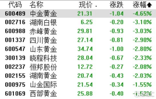 贵金属板块持续走弱,中金黄金跌超4%,湖南白银、赤峰黄金跌超3%,四川黄金、山东黄金、晓程科技跌超2%。