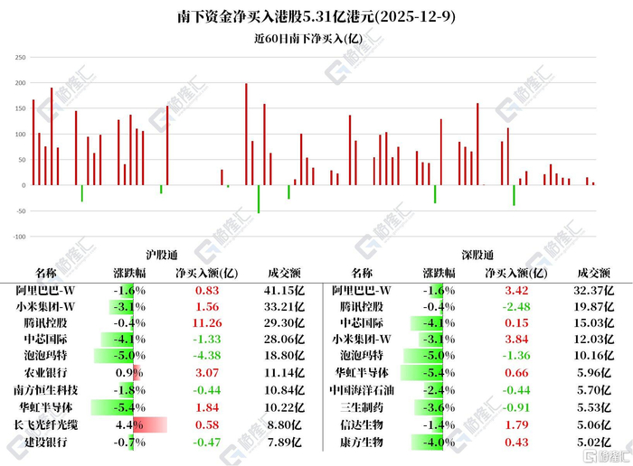 其中,净买入腾讯控股8.77亿、小米集团-W 5.39亿、阿里巴巴-W 4.25亿、农业银行3.06亿、华虹半导体2.5亿、信达生物1.79亿。