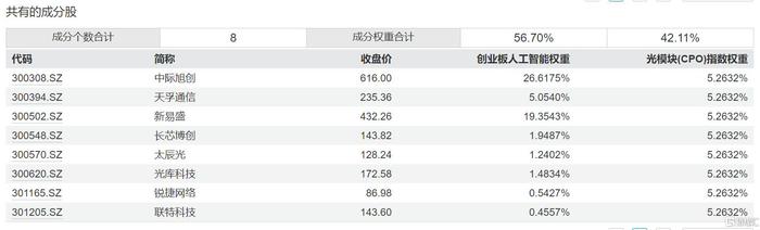 综合以上数据来看,通信设备主题指数的“CPO”含量最高,其次是创业板人工智能指数。
