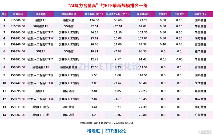 目前A股“算力含量高”的ETF跟踪的指数主要有通信设备、5G通信和创业板人工智能,其中规模最大的是国泰基金通信ETF,最新规模为124.5亿元,其次是华夏通信ETF,最新规模为82亿元。