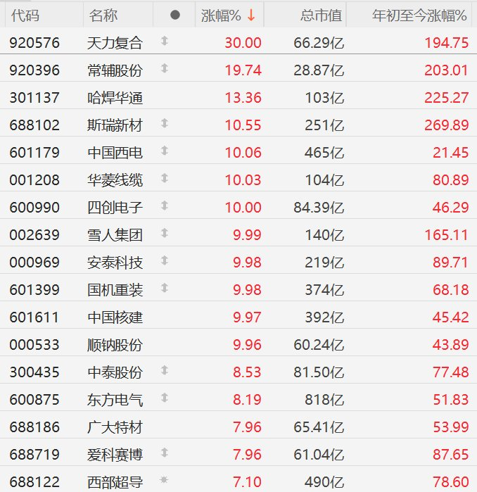 格隆汇12月12日|A股市场可控核聚变股午后涨幅进一步扩大,其中,天力复合30CM涨停,常辅股份涨近20%,哈焊华通涨超13%,斯瑞新材涨超10%,中国西电、华菱线缆、四创电子、雪人集团、安泰科技、国机重装、中国核建、顺钠股份10CM涨停,中泰股份、东方电气涨超8%,广大特材、爱科赛博、西部超导涨超7%。