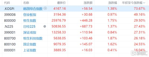 在今年亚太市场主要股指中,A股三大指数表现各异,创业板指以近50%的涨幅领涨在前,沪指则以约16%的涨幅靠后。