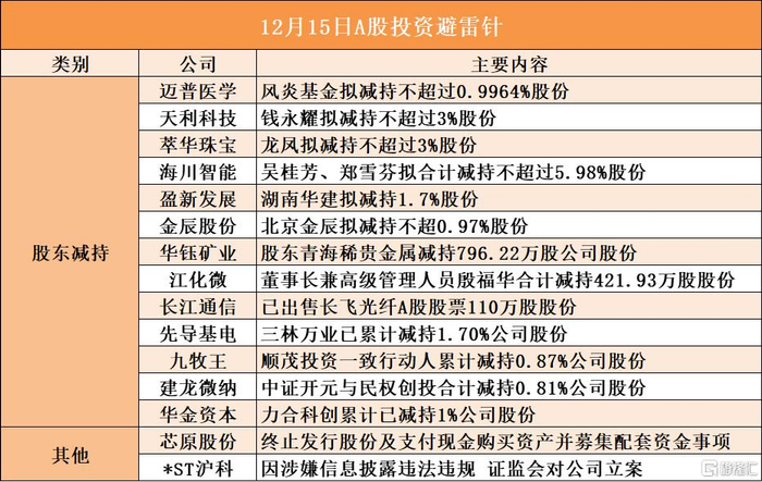 天利科技股东钱永耀拟减持不超过3%股份;萃华珠宝股东龙凤拟减持不超过3%股份;海川智能股东吴桂芳、郑雪芬拟合计减持不超过5.98%股份;江化微董事长兼高级管理人员殷福华合计减持421.93万股股份;长江通信已出售长飞光纤A股股票110万股股份;先导基电股东三林万业已累计减持1.70%公司股份;建龙微纳股东中证开元与民权创投合计减持0.81%公司股份;华金资本股东力合科创累计已减持1%公司股份;芯原股份终止发行股份及支付现金购买资产并募集配套资金事项;*ST沪科因涉嫌信息披露违法违规 证监会对公司立案