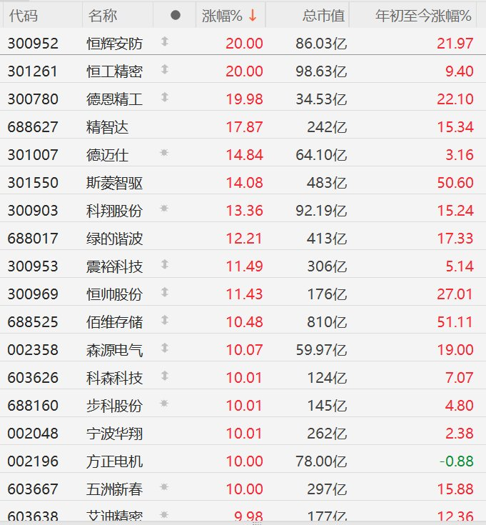 A股市场机器人概念股掀涨停潮,截至半日收盘,恒辉安防、恒工精密、德恩精工20CM涨停,精智达涨超17%,德迈仕、斯菱智驱涨超14%,科翔股份涨超13%,绿的谐波涨超12%,震裕科技、恒帅股份涨超11%,佰维存储涨超10%,森源电气、科森科技、步科股份、宁波华翔、方正电机、五洲新春、艾迪精密10CM涨停。消息面上,V3预热开始,马斯克凌晨发布与机器人的共舞视频,动作极尽丝滑。另外据悉,硅谷知名投资人Jason Calacanis在看过V3版本后给出极高评价,昨晚发表评论:没人会记得特斯拉曾经造过车,人们只会记得Optimes以及未来量产的10亿台Optimus。