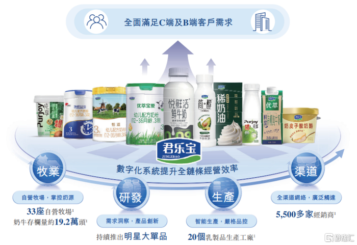 君乐宝已建立涵盖牧业、研发与产品创新、生产及销售网络的一体化产业链。