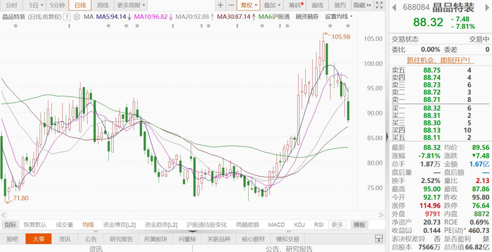 晶品特装(688084.SH)跌7.81%,报88.32元,总市值66.82亿元。军队采购网于2026年1月26日发布公告,武警部队采购管理部门根据军队供应商管理相关规定禁止北京晶品特装科技股份有限公司自2026年1月26日起3年内参加武警部队范围物资工程服务采购活动。晶品特装称,本次处理结果对公司有一定影响,但武警部队范围内军队物资工程服务相关收入在公司整体营业收入中的占比较小。公司将进一步优化业务布局,积极拓展其他领域的业务,努力保障经营稳定和可持续发展,同时加强招投标管理和代理商管理,严格遵循相关法律法规及采购规范。(格隆汇)