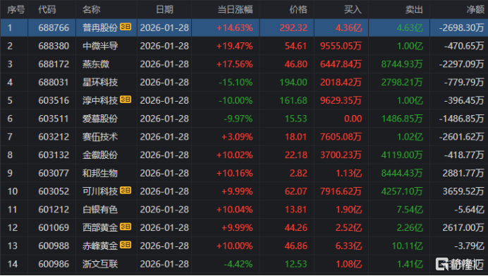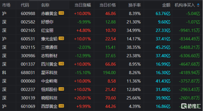 高位股方面,白银有色7连板,四川黄金10天6板,招金黄金8天5板,*ST铖昌5连板,湖南白银7天4板,巨力索具、洲际油气6天4板。