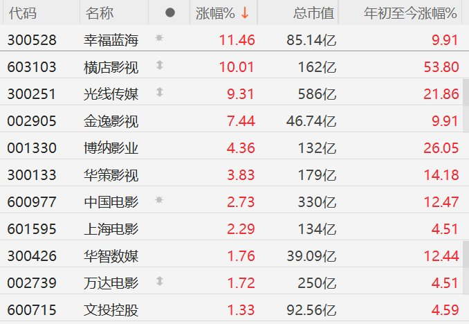 格隆汇1月30日|A股影视股逆势走强,其中,幸福蓝海涨超11%,横店影视2连板,光线传媒涨超9%,金逸影视涨超7%,博纳影业涨超4%,华策影视涨超3%,中国电影、上海电影涨超2%。消息面上,截至2026年1月28日,已有六部国产电影正式定档于2月17日大年初一上映。中金公司研报指出,2026年春节档有效放映天数为7天,与2025年持平。该机构预计,在保守、中性、乐观三种情形下,2026年春节档含服务费票房分别约为65亿元、75亿元和85亿元。