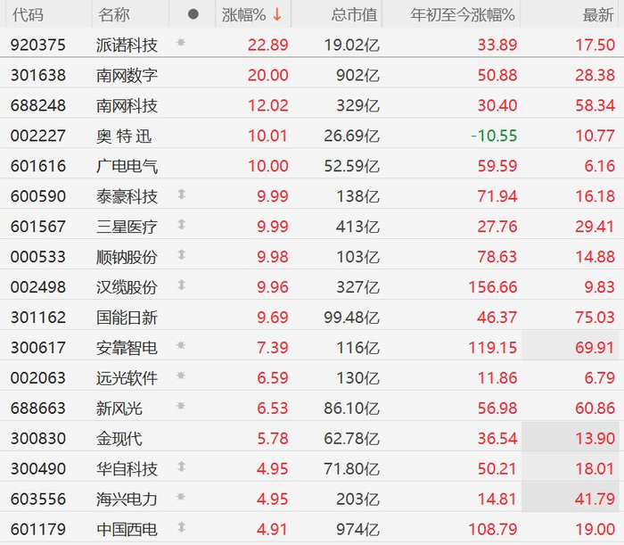 格隆汇3月6日|延续近期强势,A股市场智能电网板块今日继续走强,其中,派诺科技涨超22%,南网数字20CM涨停,南网科技涨12%,奥特迅、广电电气、泰豪科技、三星医疗、顺纳股份、汉缆股份10CM涨停,国能日新涨超9%,安靠智电涨超7%,远光软件,新风光涨超6%,金现代涨超4%,华自科技、海兴电力、中国西电涨超4%。