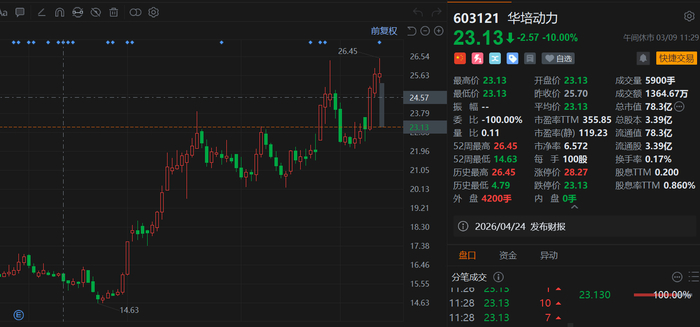 华培动力(603121.SH)复牌一字板跌停,目前封单金额高达6.55亿元,上个交易日曾创历史新高,现报23.23元,总市值78.3亿元。消息上,筹划近一个月时间,华培动力的并购事项还是黄了。华培动力3月7日披露公告称,公司终止筹划重大资产重组,即终止收购美创智感(无锡)科技有限公司100%股权并募集配套资金,这也让公司3月9日股价表现引发市场关注。并购折戟背后,华培动力经营业绩并不理想,公司2025年净利预亏2700万—4700万元。