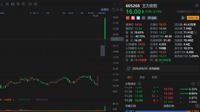 格隆汇3月11日|此前连续5日涨停的王力安防(605268.SH)今日高开低走回调超5%,报16元,总市值71.4亿元。消息上,王力安防昨日晚公告,公司股票于2026年3月4日至3月9日期间出现2次股票交易异常波动情形。2026年3月10日,公司股票再次涨停。2026年3月4日至2026年3月10日的5个交易日期间连续涨停,累计涨幅61.03%,公司股价走势已显著偏离基本面,鉴于公司股票股价短期内连续涨停,但公司基本面未发生重大变化,公司股价可能存在市场情绪过热,非理性炒作情形。