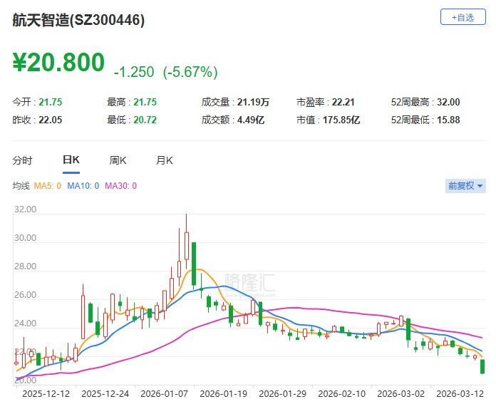 A股异动丨航天智造跌6% 股价创逾3个月新低