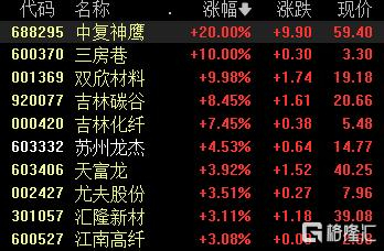 化工股走强,中复神鹰20cm涨停,三房巷、双欣材料10CM涨停,吉林碳谷涨超8%,吉林化纤涨超7%。