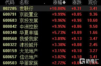 地产股大涨,世联行、京能置业、京投发展、中洲控股10CM涨停,华夏幸福涨超5%,我爱我家、大龙地产等跟跌。