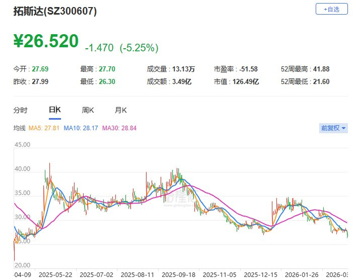 A股异动丨拓斯达跌6% 股价创近11个月新低