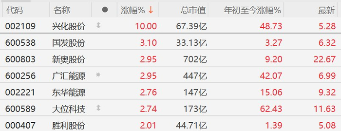 格隆汇3月19日|A股市场部分化工股上涨,其中,兴化股份涨停,国发股份涨超3%,新奥股份、广汇能源、东华能源、大位科技、胜利股份涨超2%。