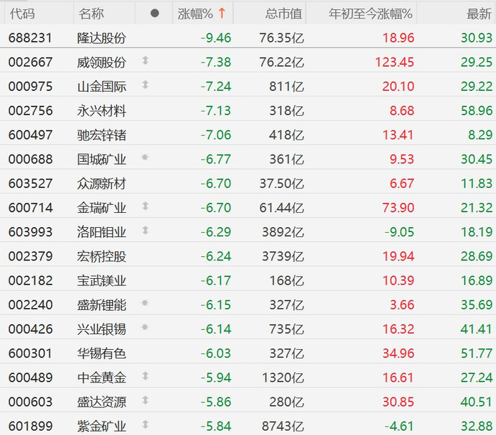 A股有色金属股集体下挫,洛阳钼业、兴业银锡跌超6%