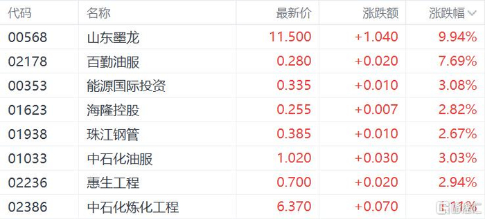 油气设备股集体走强,港股市场中,山东墨龙涨近10%,百勤油服涨7.69%,能源国际投资涨超3%,海隆控股、中石化油服跟涨。