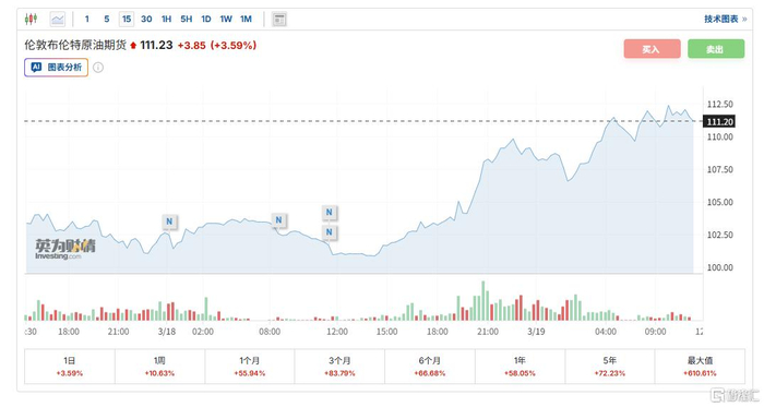这也加剧了市场对能源供应进一步中断的担忧,布伦特原油今早再度上涨,现涨3.59%报111.23美元。