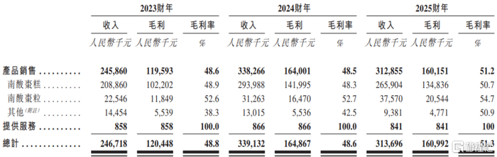 2023年、2024年和2025年,齐云山食品的收入分别约2.47亿元、3.39亿元、3.14亿元,毛利率分别为48.8%、48.6%、51.3%,对应的净利润分别约2370.5万元、5319.9万元、4892.5万元。