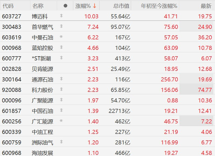 A股油气股逆势上涨,首华燃气涨超7%,中曼石油涨超6%