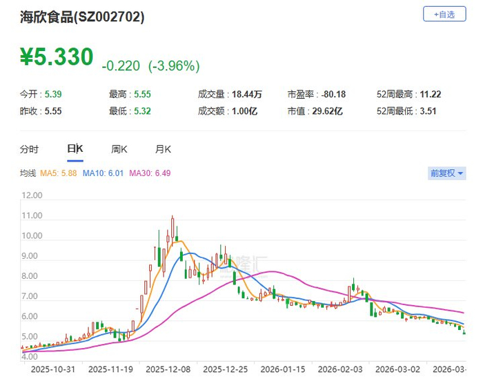 A股异动丨海欣食品跌逾4% 股价创约4个月新低