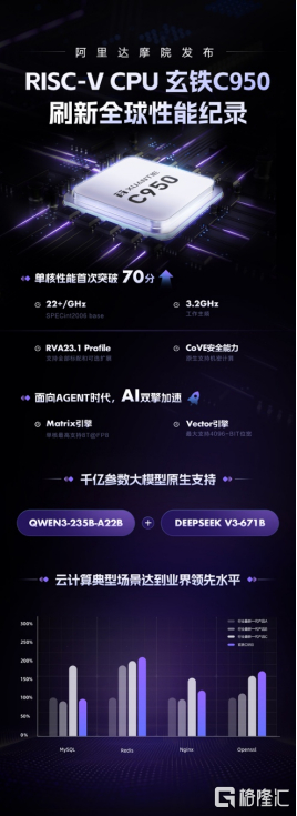 会上,达摩院发布最新一代旗舰CPU玄铁C950,刷新全球RISC-V性能纪录。其采用8指令译码、16级流水线、超1000条指令乱序窗口,最高主频3.2GHz,单核通用性能在SPECint2006基准测试中首次突破70。此外,玄铁C950支持RVA23.1的全部标配和可选扩展,原生支持CoVE机密计算,进一步提升在服务器场景的稳定性、安全性和资源利用率。经软硬件协同优化,玄铁C950在MySQL、Redis、Nginx、OpenSSL等云计算典型任务下达到业界领先水平,云网络、云存储性能较部分主流产品可提升30%以上。