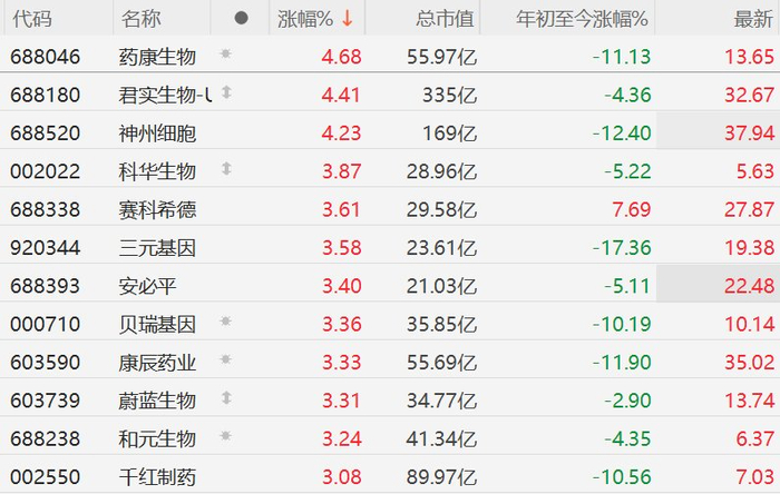 格隆汇3月24日|A股市场生物科技股普涨,其中,药康生物、君实生物、神州细胞涨超4%,科华生物、赛科希德、三元基因、安必平、贝瑞基因、康辰药业、蔚蓝生物、和元生物、千红制药涨超3%。