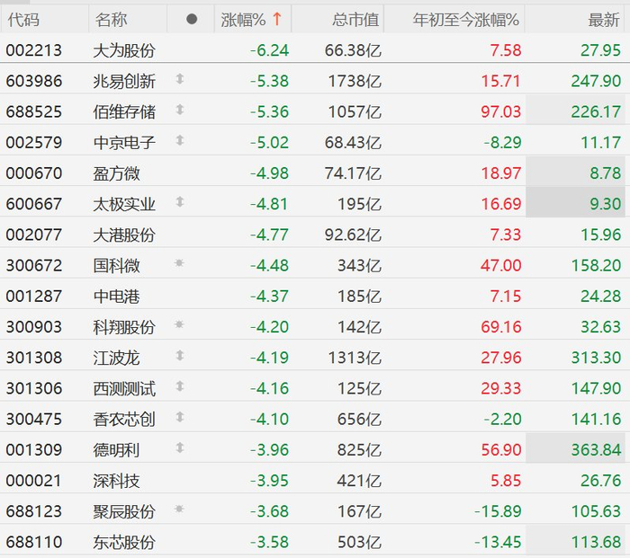 格隆汇3月27日|本周谷歌公布了一项可能减少AI模型所需内存量的技术,美国市场存储芯片股已连续第二日大跌。受此影响,A股市场存储芯片股今日也再度集体下挫。其中,大为股份跌超6%,兆易创新、佰维存储、中京电子跌超5%,盈方微、太极实业、大港股份、国科微、中电港、科翔股份、江波龙、西测测试、香农芯创跌超4%。