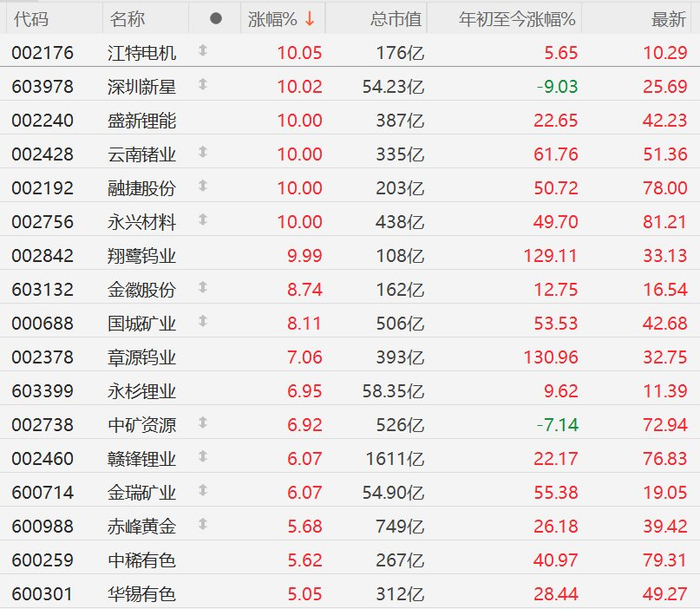 格隆汇3月27日|A股市场有色金属股集体走强,其中,江特电机、深圳新星、盛新锂能、云南锗业、融捷股份、永兴材料、翔鹭钨业涨停,金徽股份、国城矿业涨超8%,章源钨业涨超7%,永杉锂业、中矿资源、赣锋锂业、金瑞矿业涨超6%,赤峰黄金、中稀有色、华锡有色涨超5%。