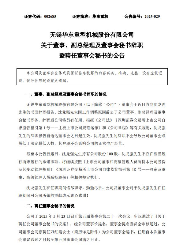 事情这样事儿滴,5月23日,华东重机(002685)发布关于董事、副总经理及董事会秘书辞职暨聘任董事会秘书的公告,涉及人事变动的主角为沈龙强。