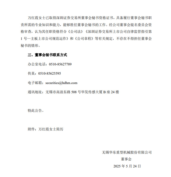 截至5月23日,沈龙强先生持有华东重机股份100股。沈龙强卸任董秘后,华东重机从内部提拔证券事务代表万红霞女士担任董事会秘书。万红霞,出生于1990年,已获深交所董事会秘书资格证书,具有从业资格。(草根光伏)