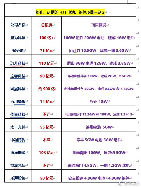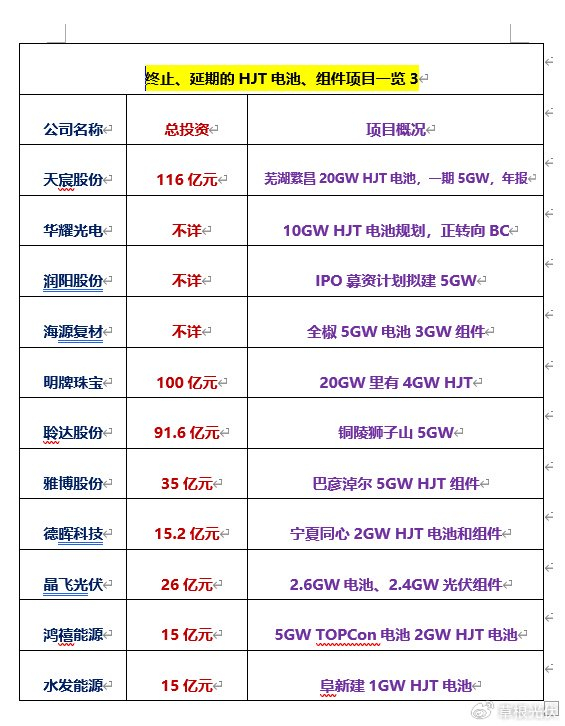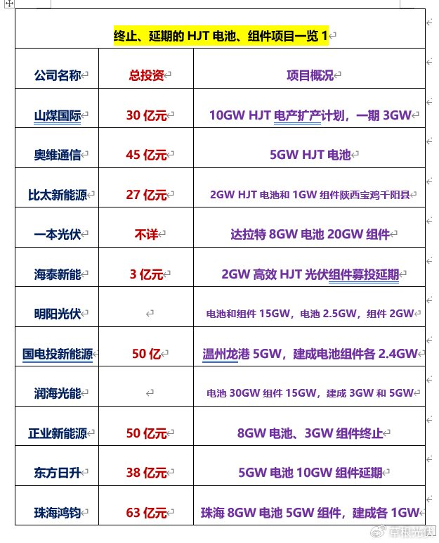 官宣终止的HJT电池、组件项目有山煤国际10GW HJT电池,奥维通信总投资45亿元5GW HJT电池项目。除了这些项目之外,太一光伏徐州空港 5GW HJT电池项目,润阳股份5GW HJT电池项目,乐通股份安吉各4.8GW电池和组件项目等或也将延期。
