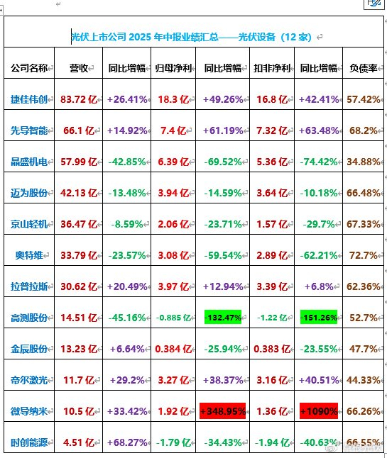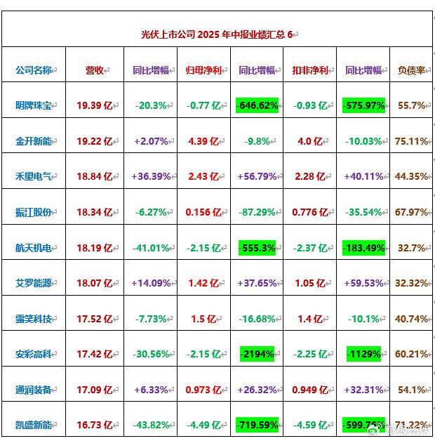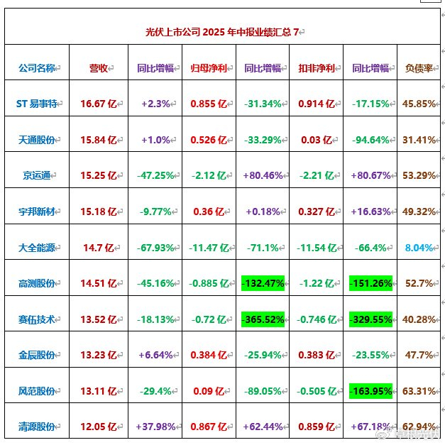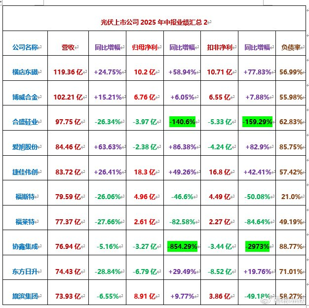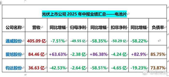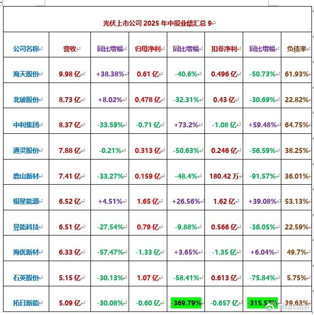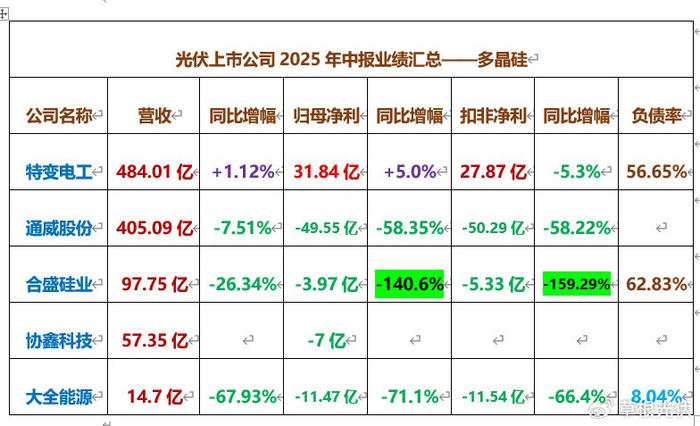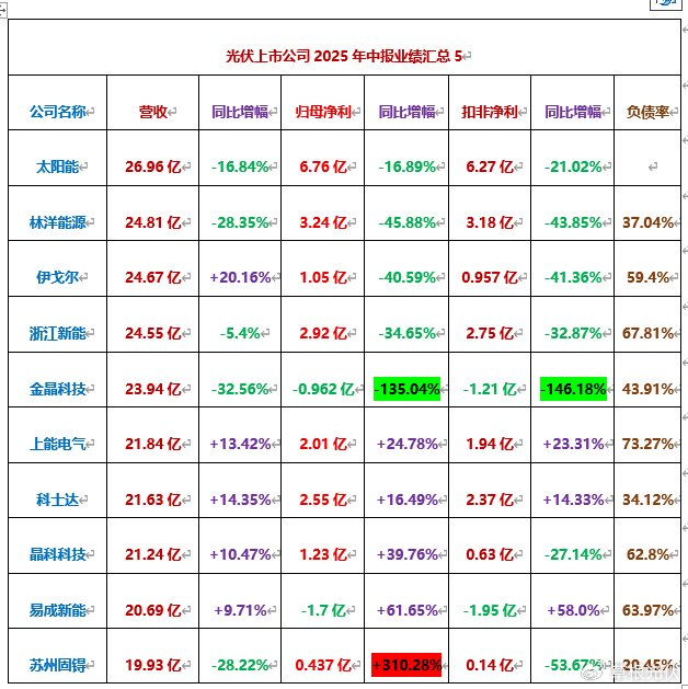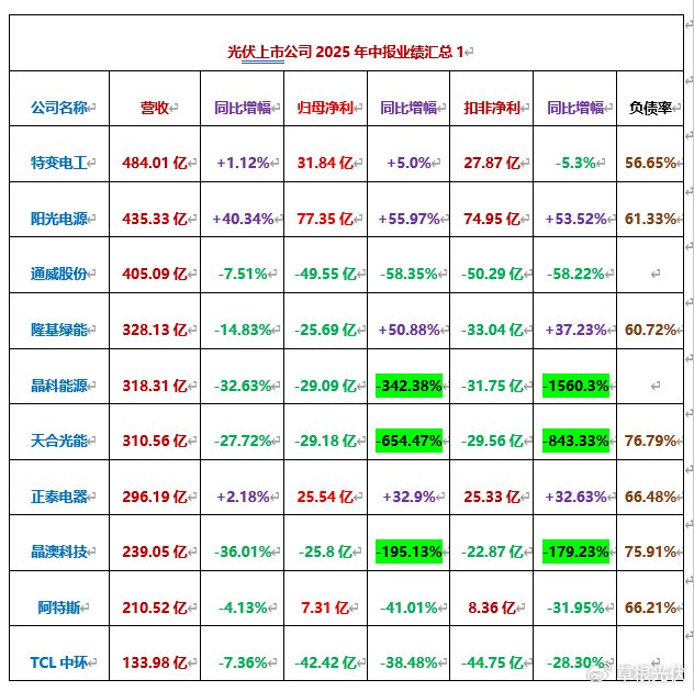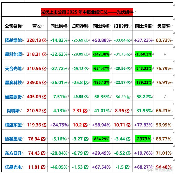 隆基绿能2025上半年归母净利亏损25.69亿,晶科能源亏损29.09亿,天合光能亏损29.18亿,晶澳科技亏损25.8亿,通威股份亏损49.55亿,阿特斯净利7.31亿,横店东磁净利10.2亿,协鑫集成亏损3.27亿,东方日升亏损6.79亿,亿晶光电2025亏损1.53亿元。