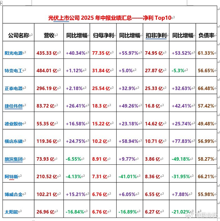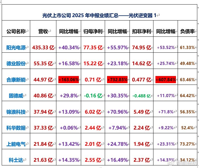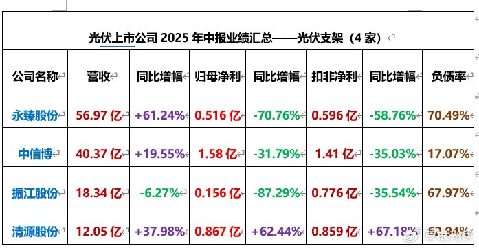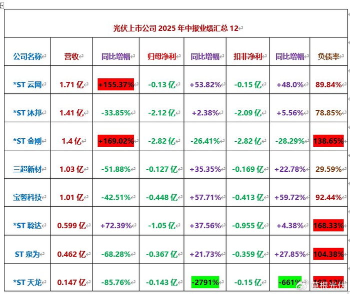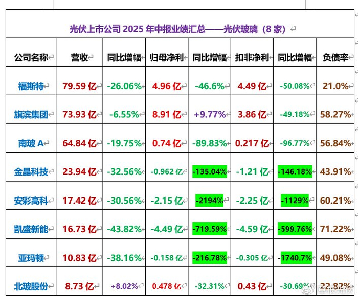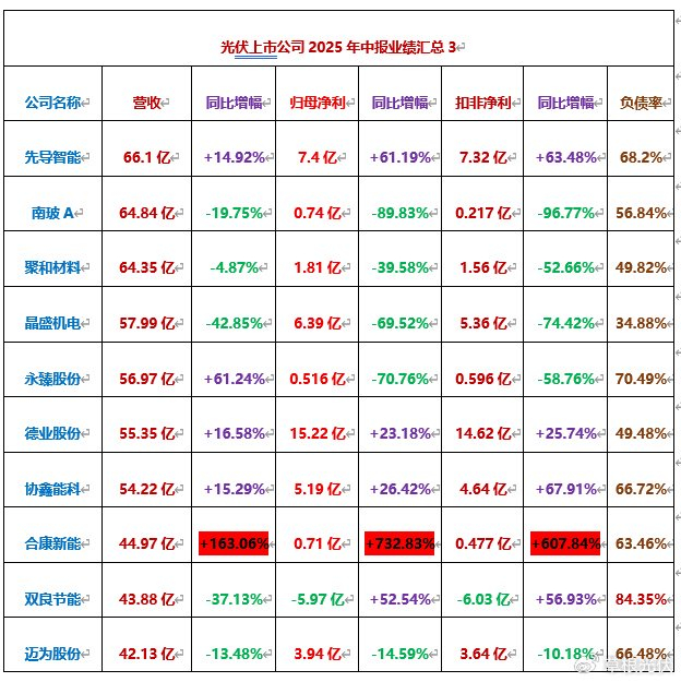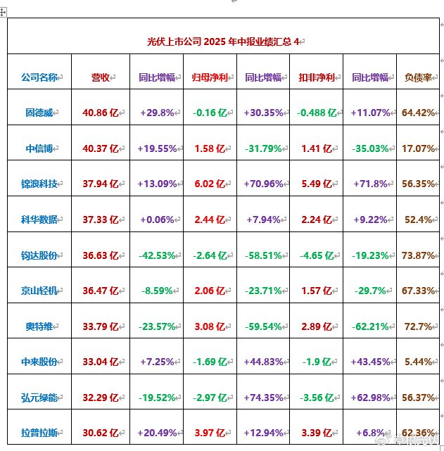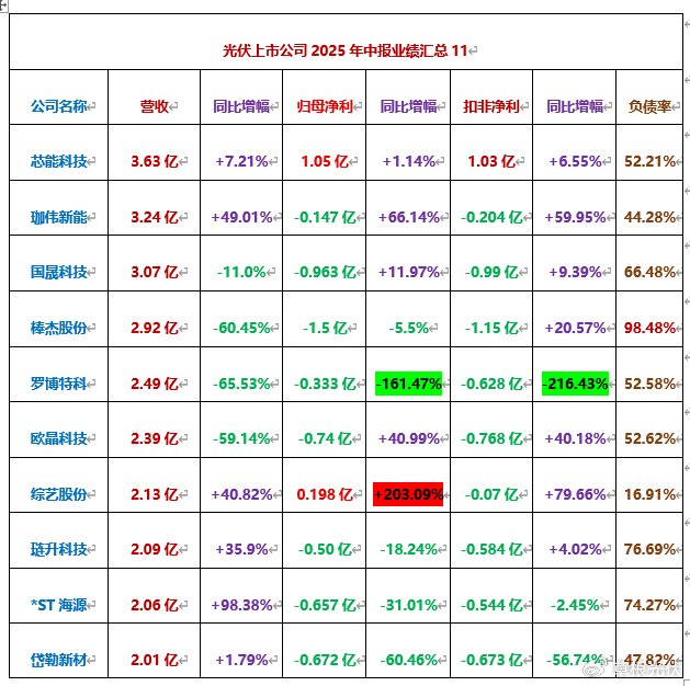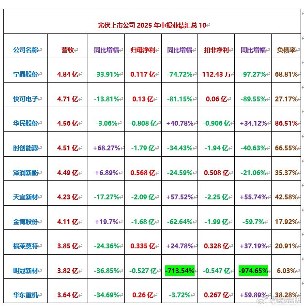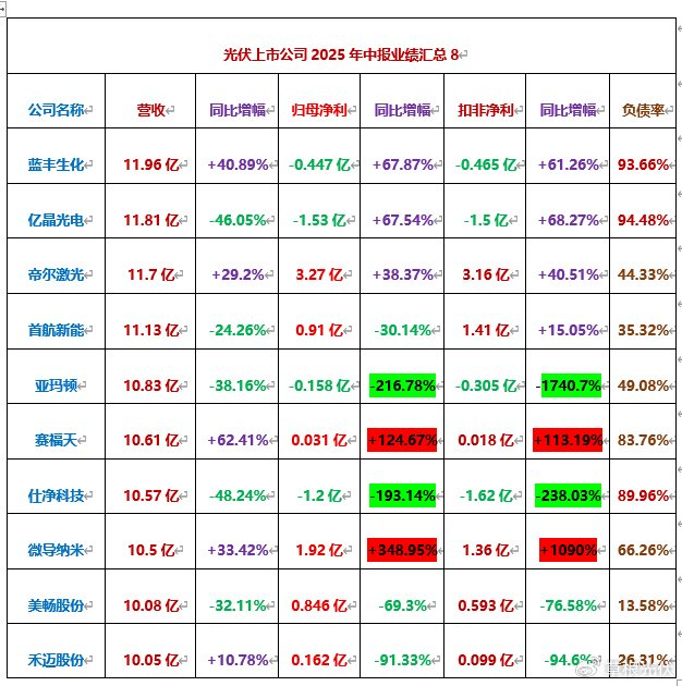 隆基绿能2025上半年归母净利亏损25.69亿,晶科能源亏损29.09亿,天合光能亏损29.18亿,晶澳科技亏损25.8亿,通威股份亏损49.55亿,阿特斯净利7.31亿,横店东磁净利10.2亿,协鑫集成亏损3.27亿,东方日升亏损6.79亿,亿晶光电2025亏损1.53亿元。