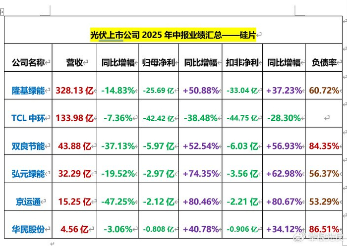 硅片环节6家主要上市公司,2025年H1业绩全线亏损。隆基绿能亏损25.69亿元,TCL中环亏损42.42亿元,双良节能亏5.97亿,弘元绿能亏损2.97亿,京运通亏损2.12亿元,华民股份亏损0.808亿。