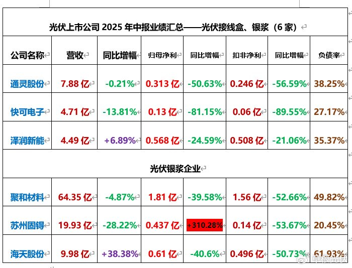 光伏接线盒环节,上市公司体量相对较小,营收和净利规模都不大。通灵股份2025年H1实现营收7.88亿净利0.313亿,快可电子实现营收4.71亿净利0.13亿,泽润新能实现营收4.49亿净利0.568亿。