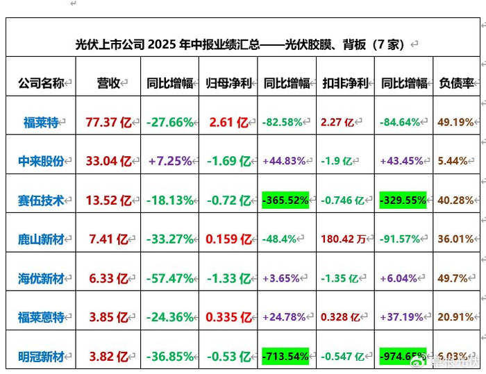 光伏胶膜龙头福莱特2025年H1实现营收77.37亿元,同比下滑27.66%,归母净利润为2.61亿,同比降幅更高达82.58%。这表明光伏行业的周期性调整已由核心制造业产业链传导到光伏辅材环节。