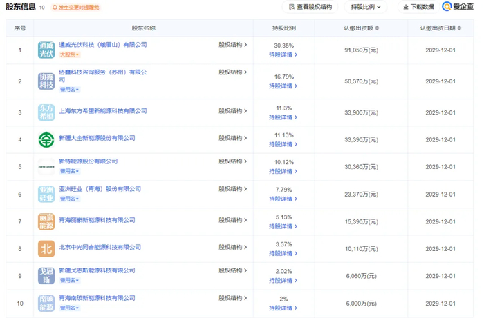 亚洲硅业(青海)股份有限公司认缴出资23,370万元持股7.79%,青海丽豪新能源科技有限公司认缴出资15,390万元持股5.13%,北京中光同合能源科技有限公司认缴出资10,110万元持股3.37%,新疆戈恩斯能源科技有限公司认缴出资6,060万持股2.02%,青海南玻新能源科技有限公司认缴出资6,000万元持股2%。