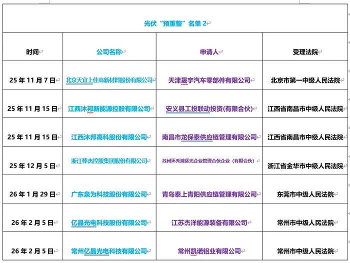2026年2月5日,江苏杰洋能源装备有限公司在常州市中级人民法院对亿晶光电科技股份有限公司(简称“亿晶光电”)申请预重整。常州凯诺铝业有限公司则在常州市中级人民法院对常州亿晶光电科技有限公司(简称“常州亿晶”)申请预重整。