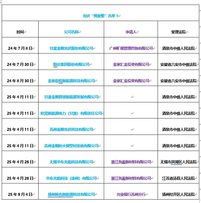 以时间轴划分,2024年被债权人申请预重整的有2家,为聆达集团股份有限公司(简称“聆达股份”)和控股子公司金寨嘉悦新能源科技有限公司(简称“金寨嘉悦”),以及甘肃金刚光伏股份有限公司(简称“金刚光伏”)。