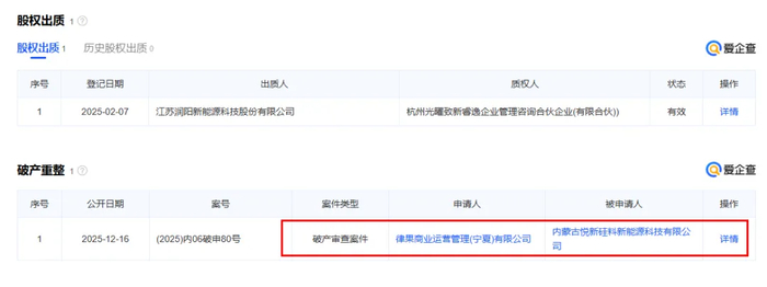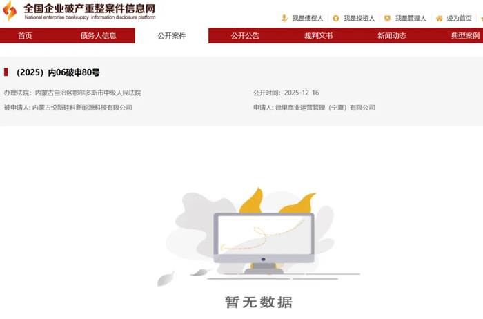 律果商业运营管理(宁夏)有限公司对内蒙古悦新硅料新能源科技有限公司申请破产重整,公开日期为2025年12月16日,案号为(2025)内06破申80号。全国企业破产重组信息网同样上传了相关信息,这起破产审查案的经办法院为内蒙古自治区鄂尔多斯市中级人民法院。