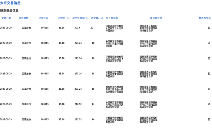 9月29日,国茂股份大宗交易成交120万股,成交额1821.6万元,占当日总成交额的9.15%,成交价15.18元,较市场收盘价17.22元折价11.85%。