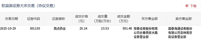 10月29日,西点药业大宗交易成交23.53万股,成交额591.48万元,占当日总成交额的10.65%,成交价25.14元,较市场收盘价30.82元折价18.43%。