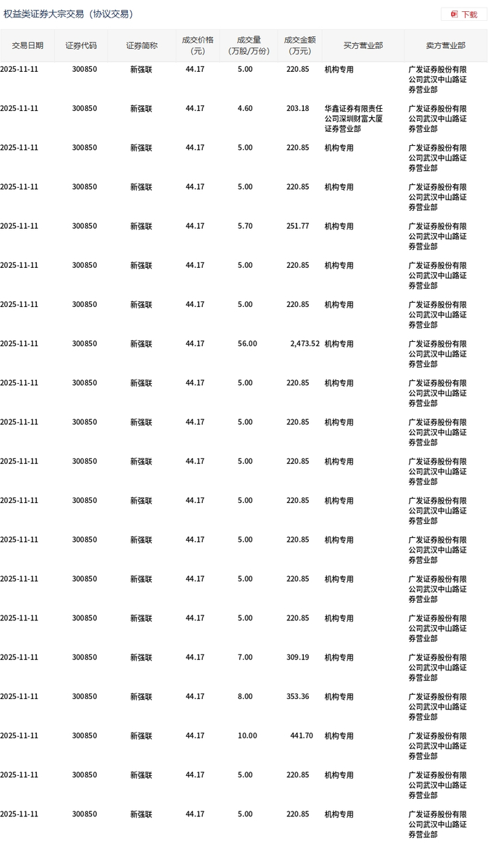 11月11日,新强联大宗交易成交277.1万股,成交额1.22亿元,占当日总成交额的14.23%,成交价44.17元,较市场收盘价47.78元折价7.56%。