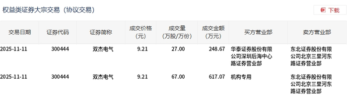 11月11日,双杰电气大宗交易成交94万股,成交额865.74万元,占当日总成交额的0.44%,成交价9.21元,较市场收盘价10.47元折价12.03%。