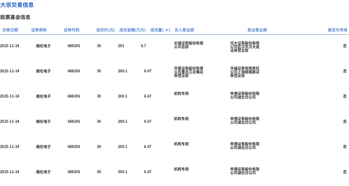 11月14日,概伦电子大宗交易成交183.25万股,成交额5497.5万元,占当日总成交额的9.95%,成交价30元,较市场收盘价36.1元折价16.9%。