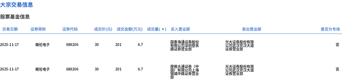 11月17日,概伦电子大宗交易成交13.4万股,成交额402万元,占当日总成交额的1.43%,成交价30元,较市场收盘价35.35元折价15.13%。