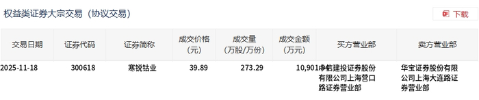 11月18日,寒锐钴业大宗交易成交273.29万股,成交额1.09亿元,占当日总成交额的12.75%,成交价39.89元,较市场收盘价47.78元折价16.51%。