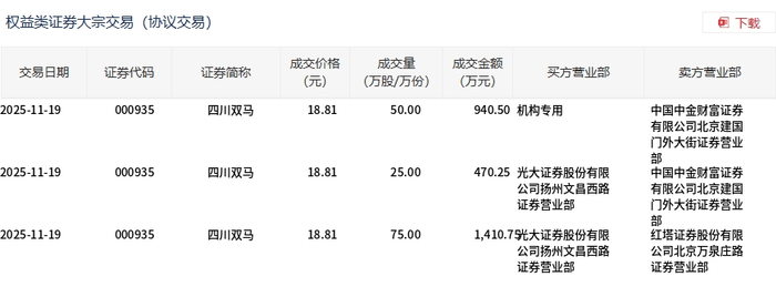 11月19日,四川双马大宗交易成交150万股,成交额2821.5万元,占当日总成交额的7.81%,成交价18.81元,较市场收盘价20.9元折价10%。